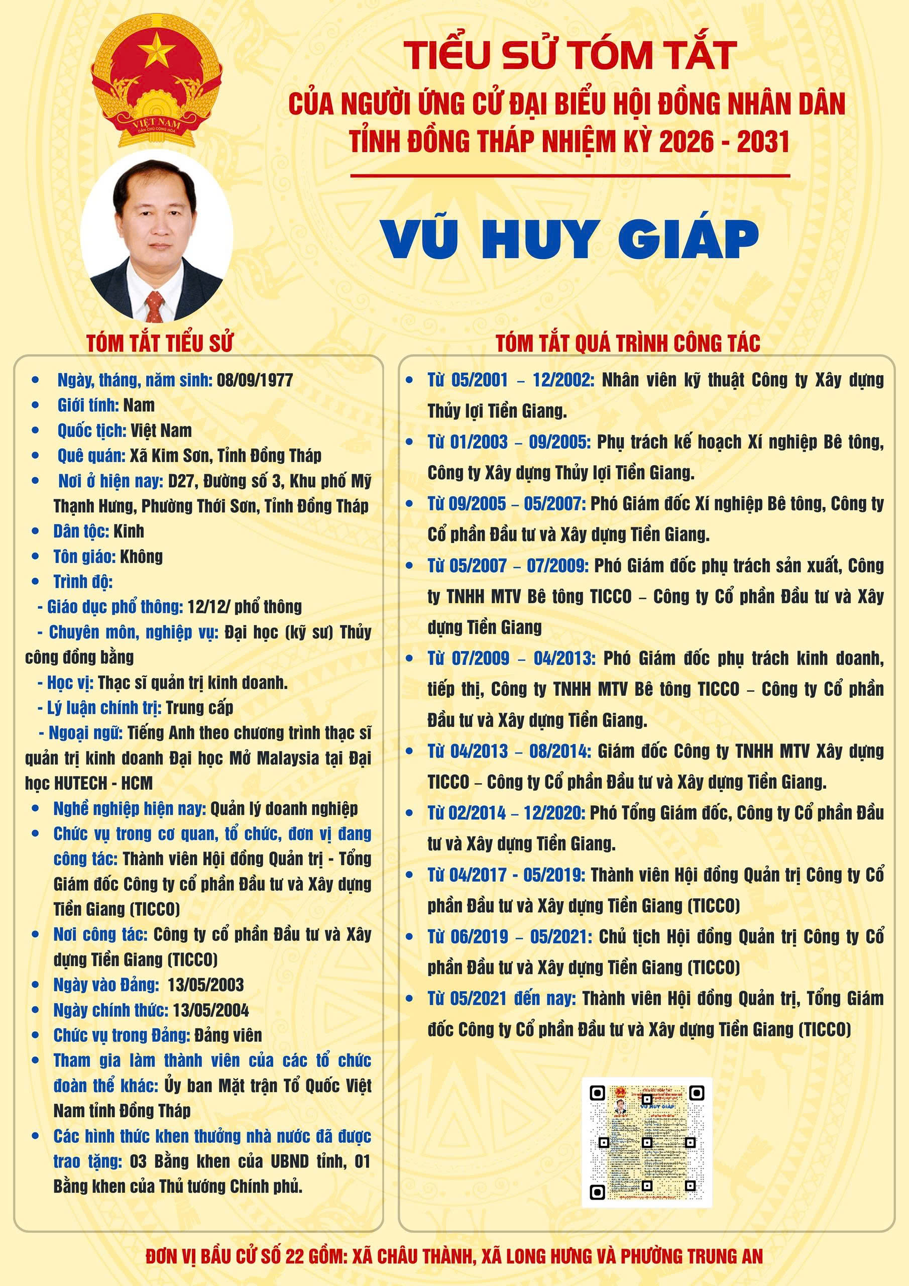 Tại đơn vị bầu cử số 22 (gồm các xã: Châu Thành, Long Hưng và Phường Trung An ), Thạc sĩ Vũ Huy Giáp – Thành viên Hội đồng quản trị kiêm Tổng giám đốc Công ty Cổ phần Đầu tư và Xây dựng Tiền Giang (TICCO) – đã tham gia ứng cử và trúng cử đại biểu Hội đồng nhân dân tỉnh Đồng Tháp khóa XI, nhiệm kỳ 2026 – 2031.